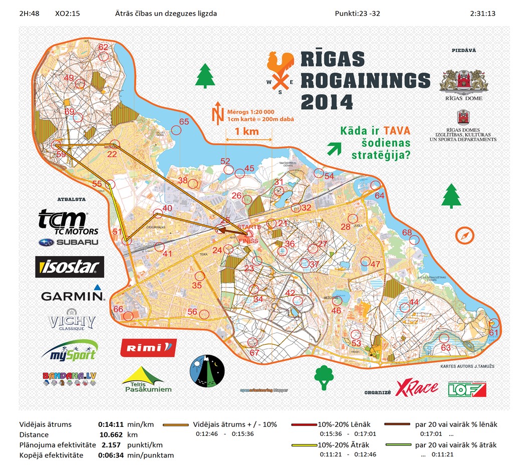 | Secības nr | KP nr | Laiks | Punkti | Kopējie punkti | Posma laiks | Kopējais laiks | Posma distance | Kopējā distance | min/km | min/pts | Vieta etapā |