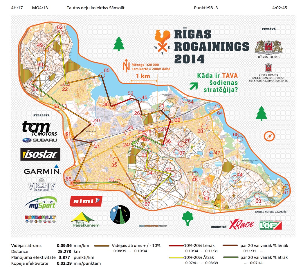 | Secības nr | KP nr | Laiks | Punkti | Kopējie punkti | Posma laiks | Kopējais laiks | Posma distance | Kopējā distance | min/km | min/pts | Vieta etapā |