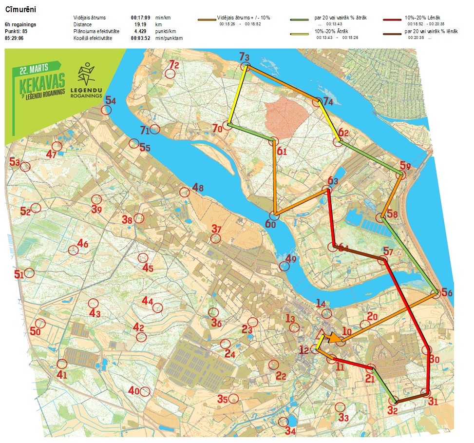 | Secības nr | KP nr | Laiks | Punkti | Kopējie punkti | Posma laiks | Kopējais laiks | Posma distance | Kopējā distance | min/km | min/pts | Vieta etapā |