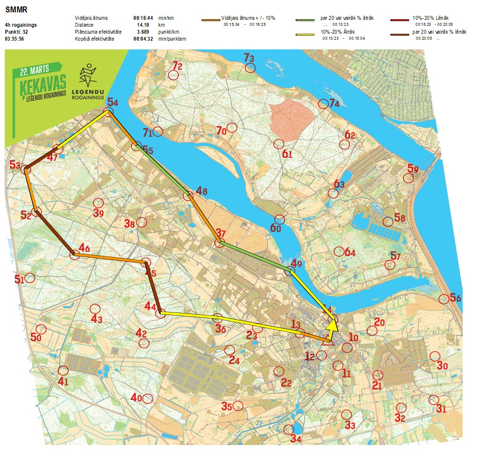 | Secības nr | KP nr | Laiks | Punkti | Kopējie punkti | Posma laiks | Kopējais laiks | Posma distance | Kopējā distance | min/km | min/pts | Vieta etapā |