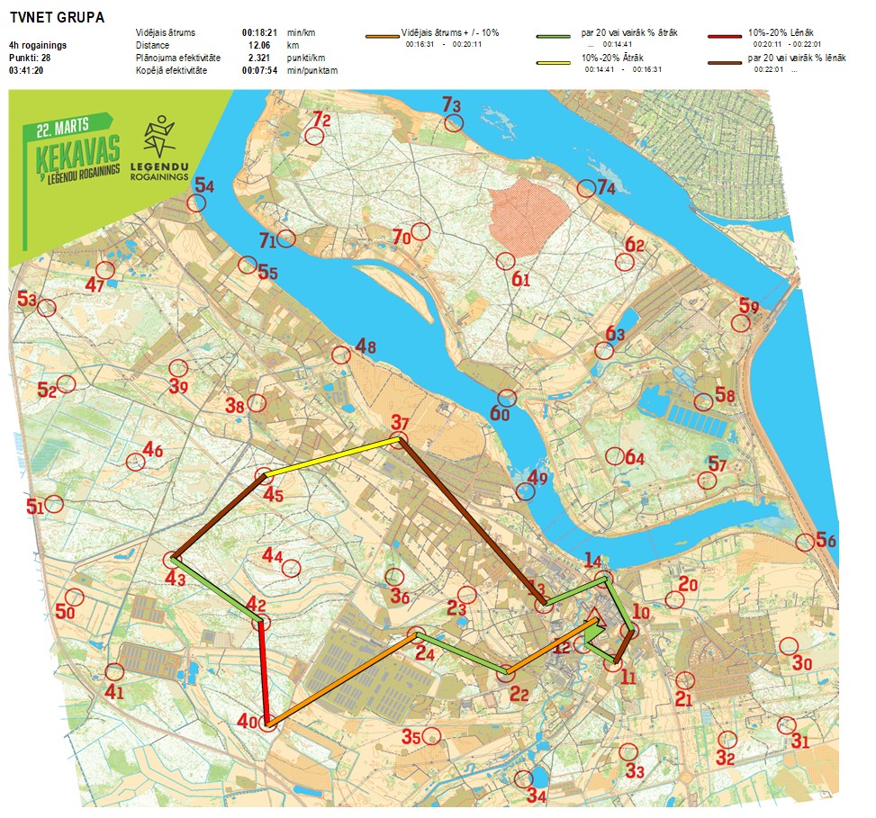 | Secības nr | KP nr | Laiks | Punkti | Kopējie punkti | Posma laiks | Kopējais laiks | Posma distance | Kopējā distance | min/km | min/pts | Vieta etapā |