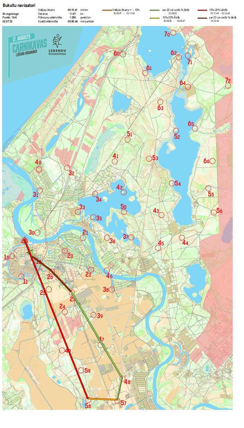 | Secības nr | KP nr | Laiks | Punkti | Kopējie punkti | Posma laiks | Kopējais laiks | Posma distance | Kopējā distance | min/km | min/pts | Vieta etapā |