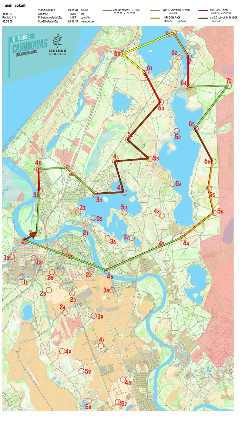 | Secības nr | KP nr | Laiks | Punkti | Kopējie punkti | Posma laiks | Kopējais laiks | Posma distance | Kopējā distance | min/km | min/pts | Vieta etapā |