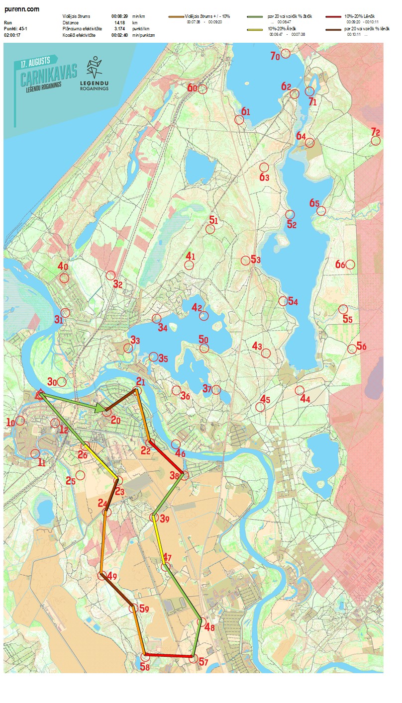 | Secības nr | KP nr | Laiks | Punkti | Kopējie punkti | Posma laiks | Kopējais laiks | Posma distance | Kopējā distance | min/km | min/pts | Vieta etapā |