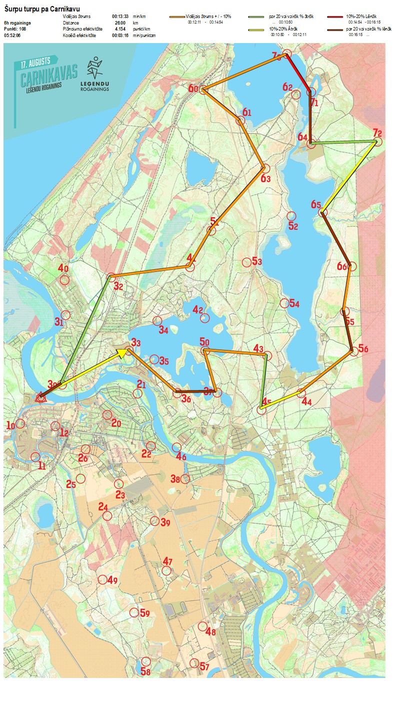| Secības nr | KP nr | Laiks | Punkti | Kopējie punkti | Posma laiks | Kopējais laiks | Posma distance | Kopējā distance | min/km | min/pts | Vieta etapā |