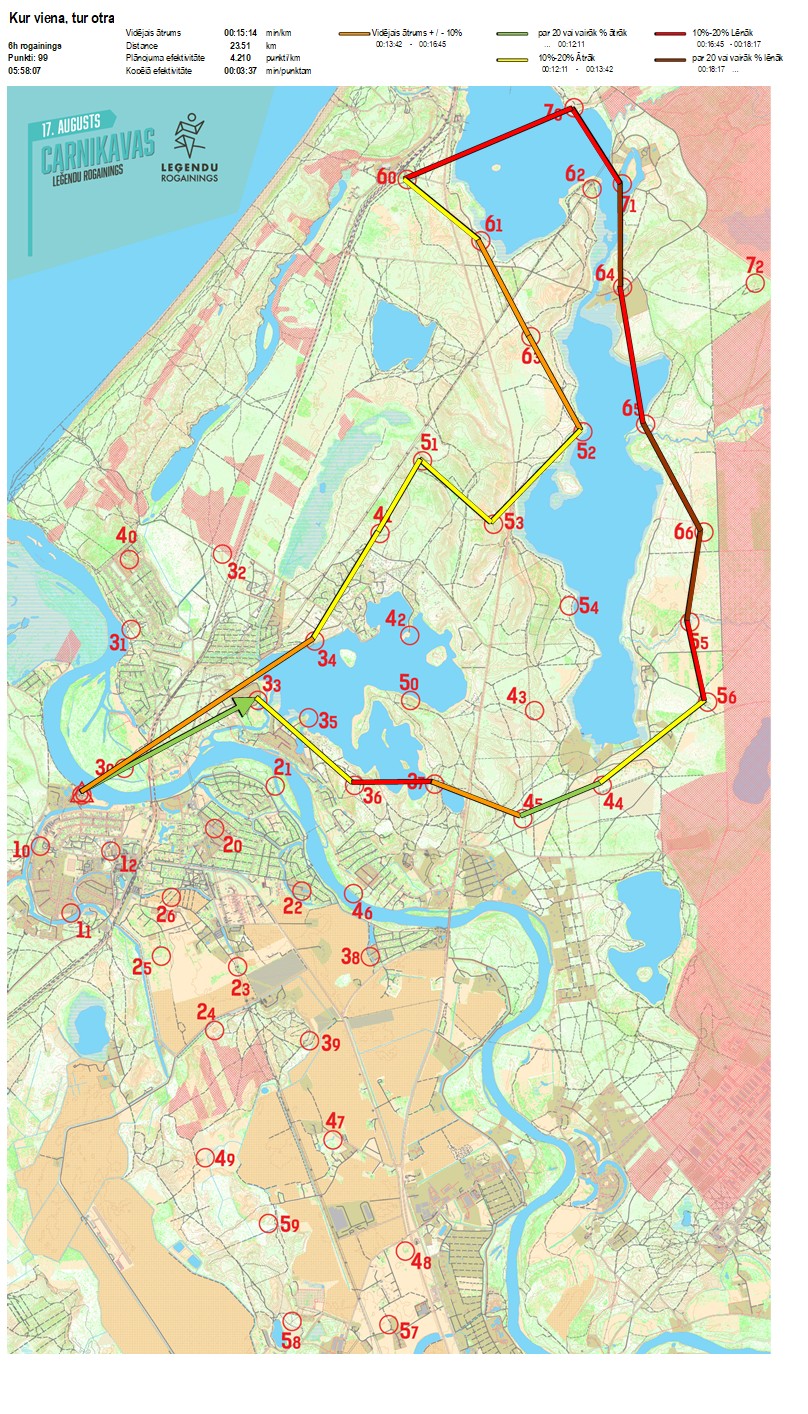 | Secības nr | KP nr | Laiks | Punkti | Kopējie punkti | Posma laiks | Kopējais laiks | Posma distance | Kopējā distance | min/km | min/pts | Vieta etapā |