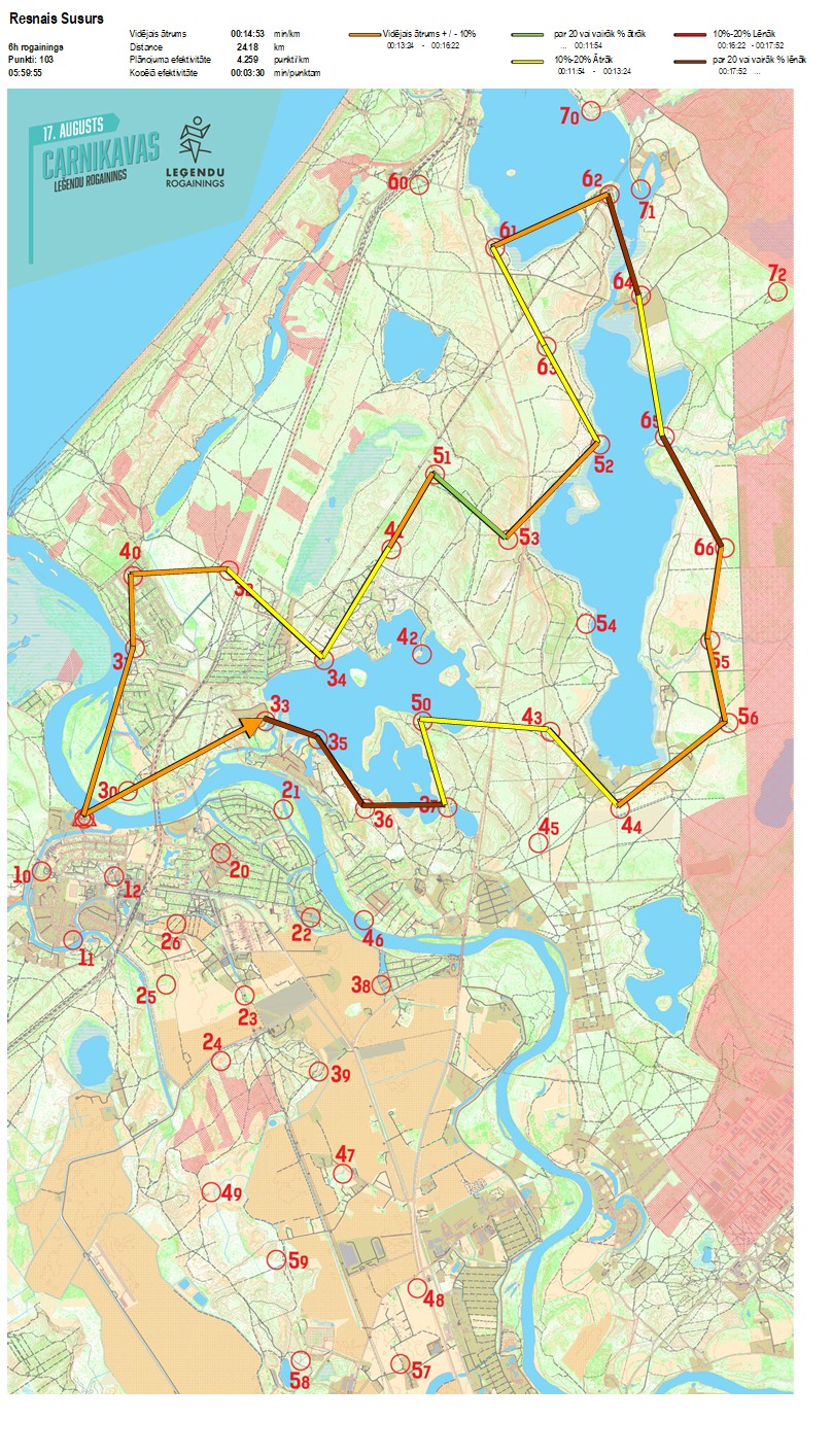 | Secības nr | KP nr | Laiks | Punkti | Kopējie punkti | Posma laiks | Kopējais laiks | Posma distance | Kopējā distance | min/km | min/pts | Vieta etapā |