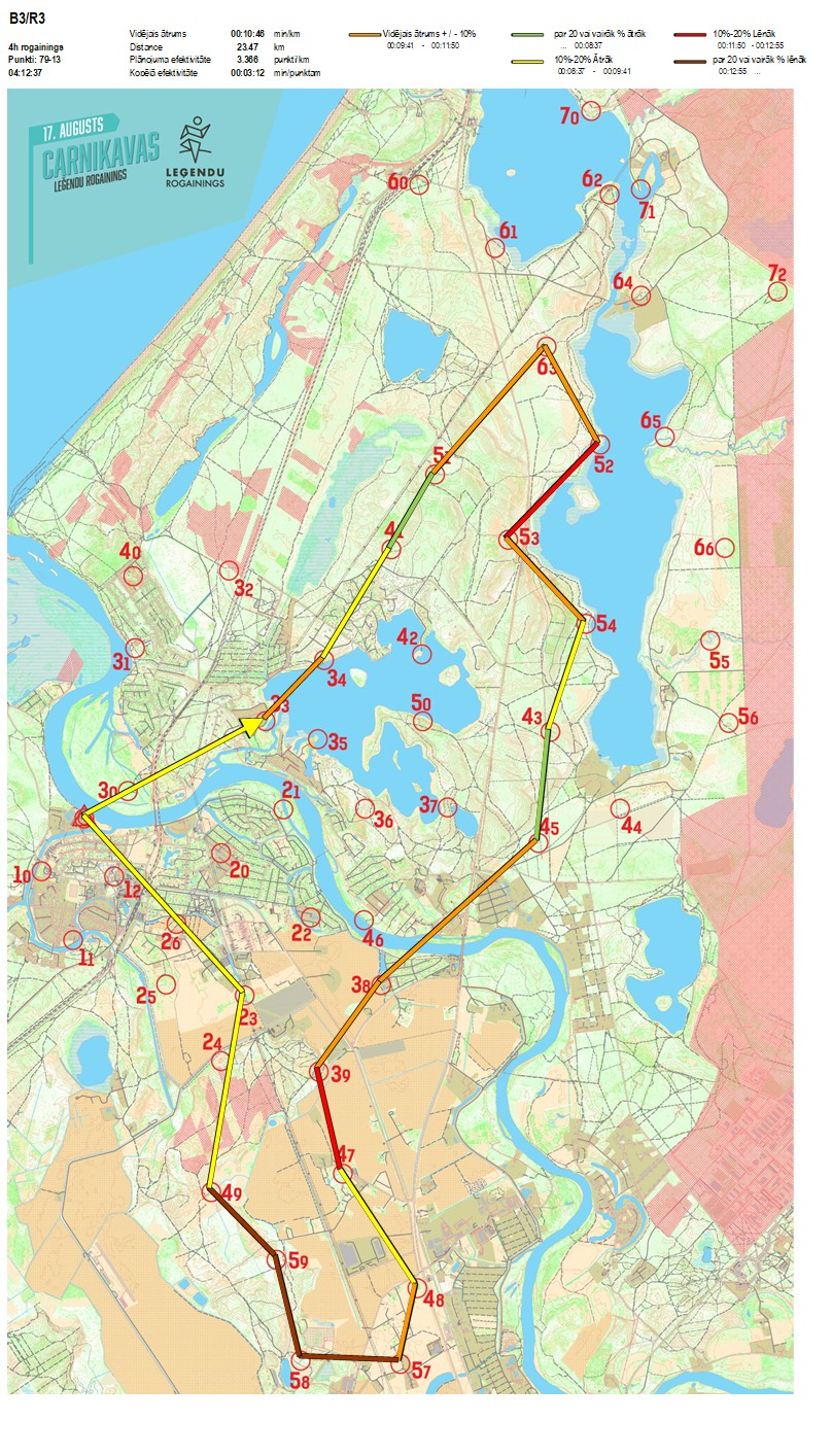| Secības nr | KP nr | Laiks | Punkti | Kopējie punkti | Posma laiks | Kopējais laiks | Posma distance | Kopējā distance | min/km | min/pts | Vieta etapā |