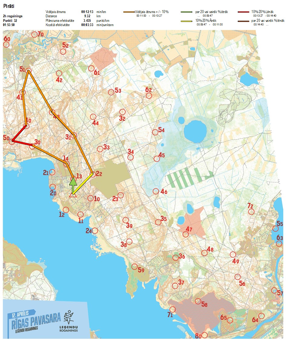 | Secības nr | KP nr | Laiks | Punkti | Kopējie punkti | Posma laiks | Kopējais laiks | Posma distance | Kopējā distance | min/km | min/pts | Vieta etapā |