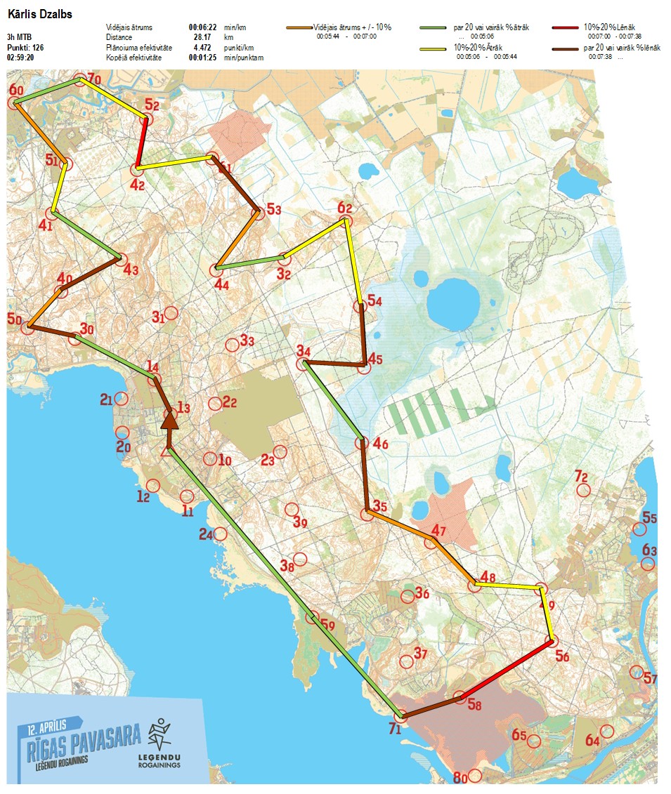 | Secības nr | KP nr | Laiks | Punkti | Kopējie punkti | Posma laiks | Kopējais laiks | Posma distance | Kopējā distance | min/km | min/pts | Vieta etapā |