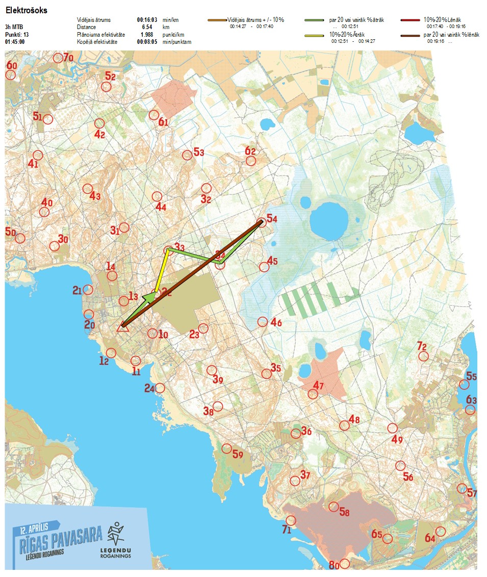 | Secības nr | KP nr | Laiks | Punkti | Kopējie punkti | Posma laiks | Kopējais laiks | Posma distance | Kopējā distance | min/km | min/pts | Vieta etapā |