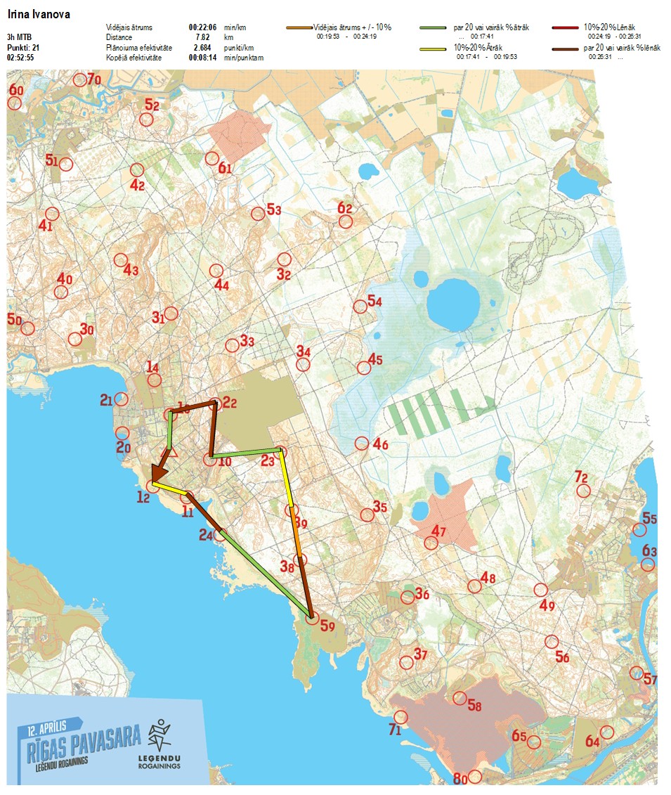 | Secības nr | KP nr | Laiks | Punkti | Kopējie punkti | Posma laiks | Kopējais laiks | Posma distance | Kopējā distance | min/km | min/pts | Vieta etapā |