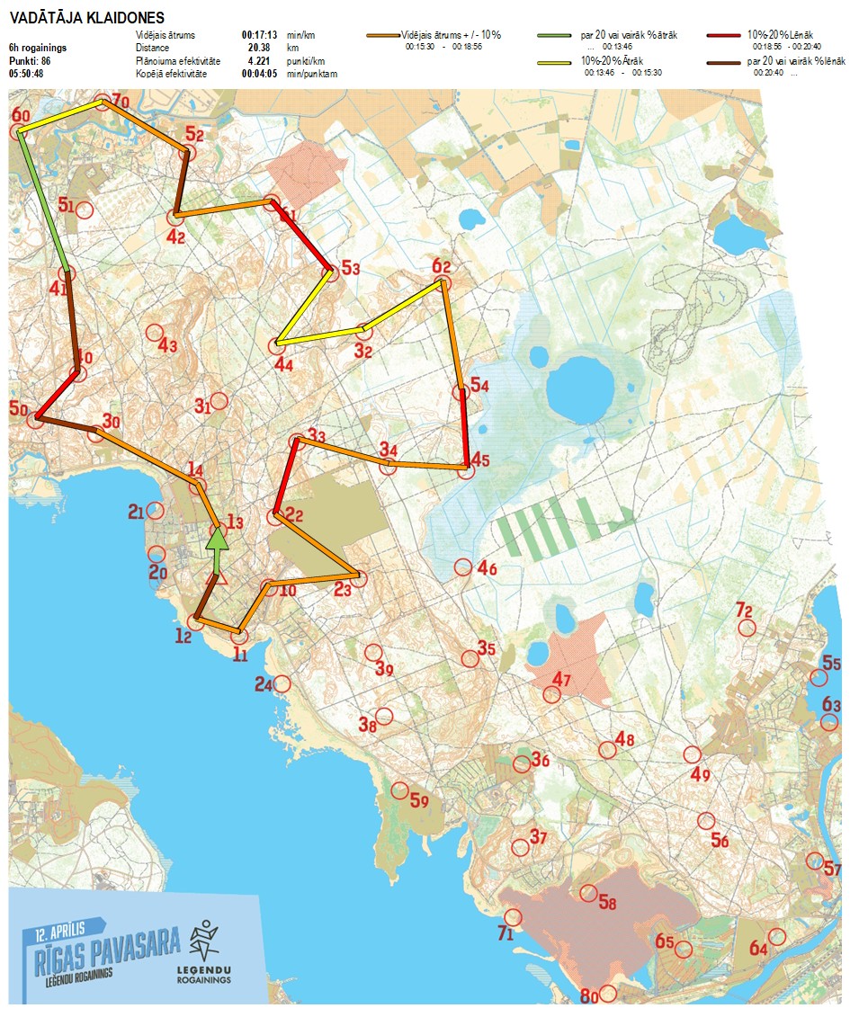 | Secības nr | KP nr | Laiks | Punkti | Kopējie punkti | Posma laiks | Kopējais laiks | Posma distance | Kopējā distance | min/km | min/pts | Vieta etapā |