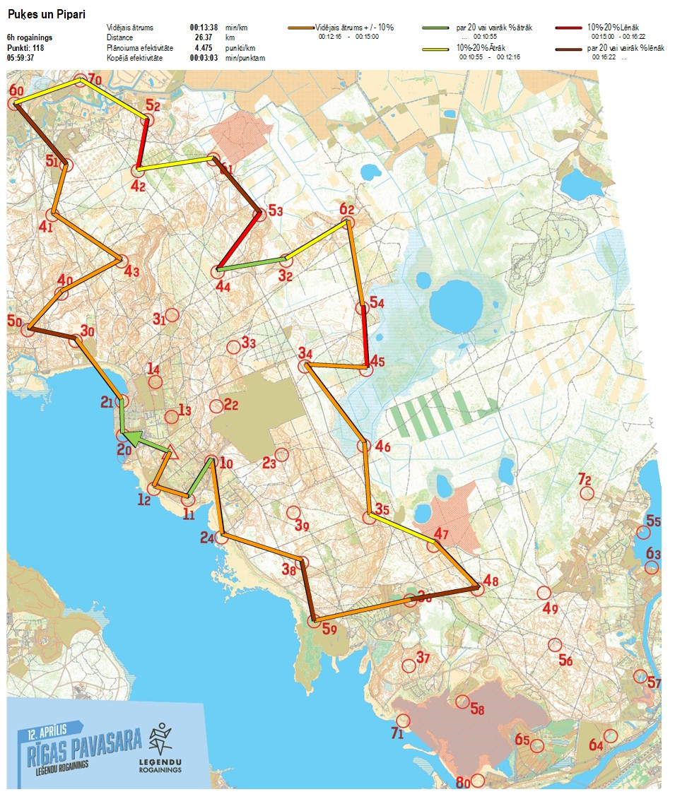 | Secības nr | KP nr | Laiks | Punkti | Kopējie punkti | Posma laiks | Kopējais laiks | Posma distance | Kopējā distance | min/km | min/pts | Vieta etapā |