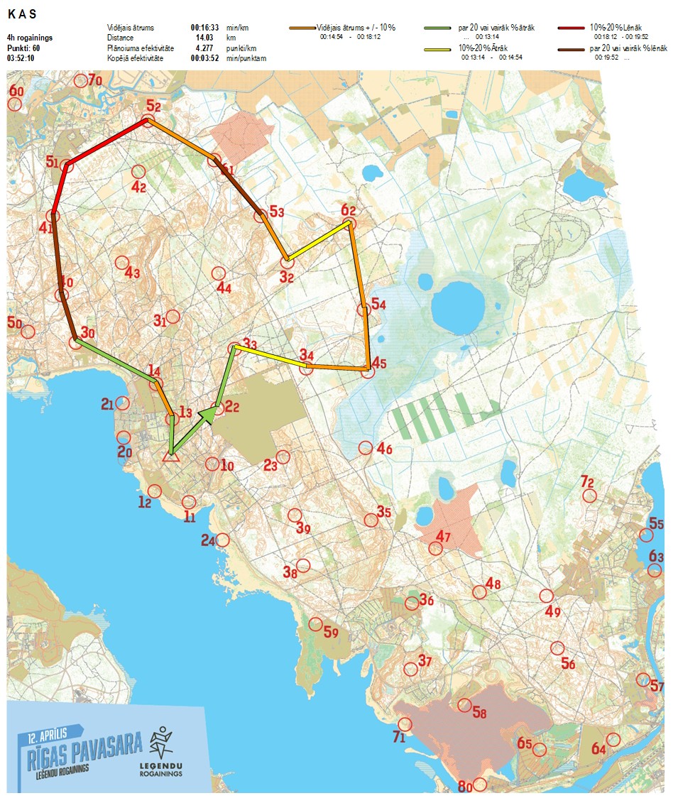 | Secības nr | KP nr | Laiks | Punkti | Kopējie punkti | Posma laiks | Kopējais laiks | Posma distance | Kopējā distance | min/km | min/pts | Vieta etapā |