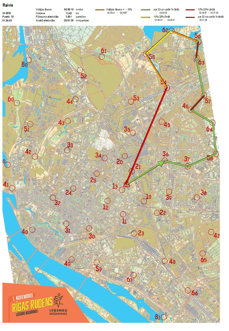 | Secības nr | KP nr | Laiks | Punkti | Kopējie punkti | Posma laiks | Kopējais laiks | Posma distance | Kopējā distance | min/km | min/pts | Vieta etapā |