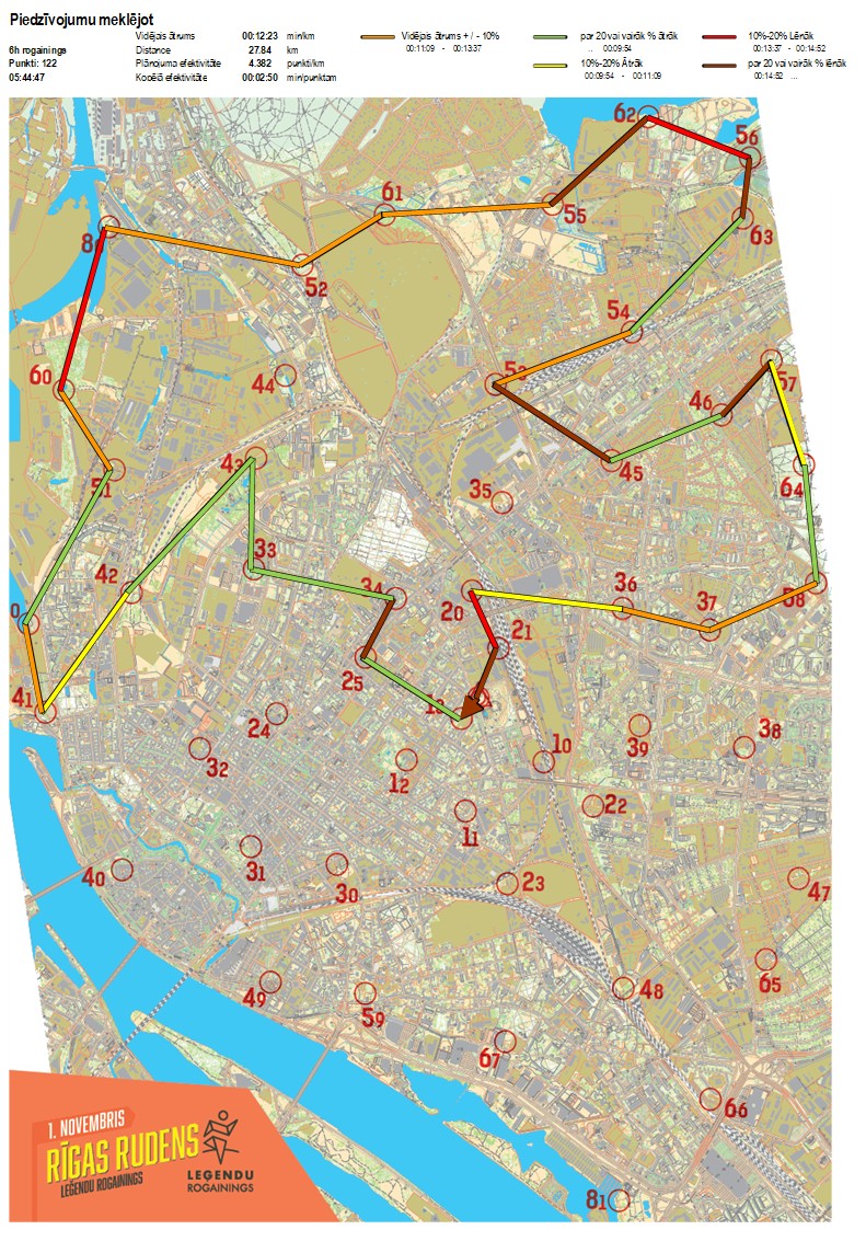 | Secības nr | KP nr | Laiks | Punkti | Kopējie punkti | Posma laiks | Kopējais laiks | Posma distance | Kopējā distance | min/km | min/pts | Vieta etapā |