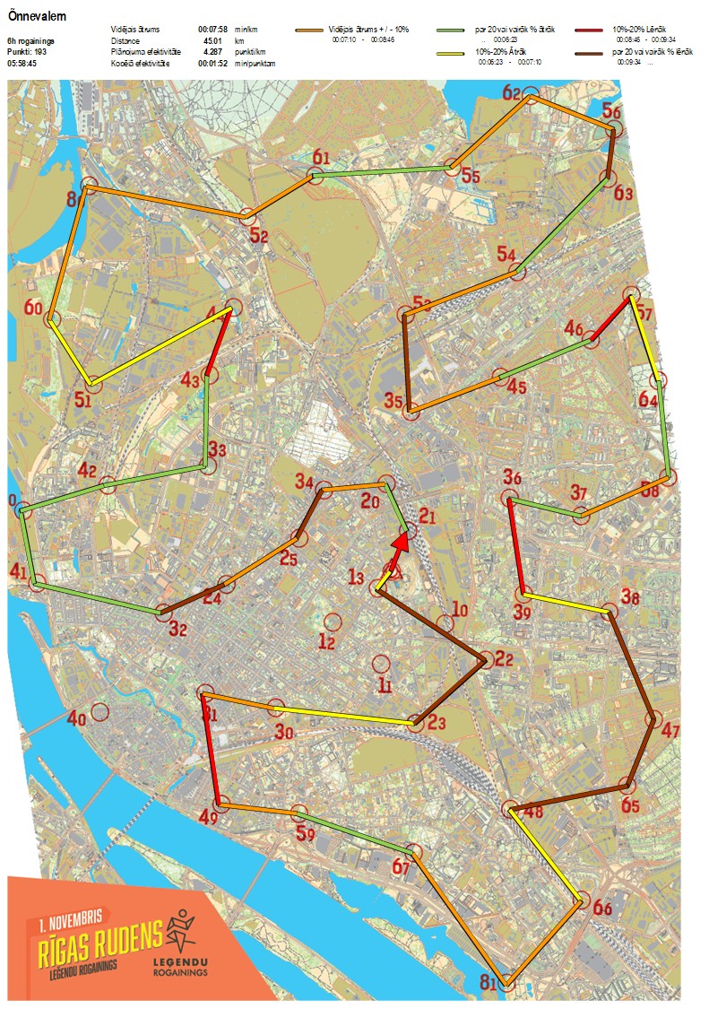 | Secības nr | KP nr | Laiks | Punkti | Kopējie punkti | Posma laiks | Kopējais laiks | Posma distance | Kopējā distance | min/km | min/pts | Vieta etapā |