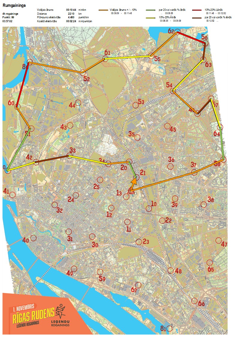 | Secības nr | KP nr | Laiks | Punkti | Kopējie punkti | Posma laiks | Kopējais laiks | Posma distance | Kopējā distance | min/km | min/pts | Vieta etapā |