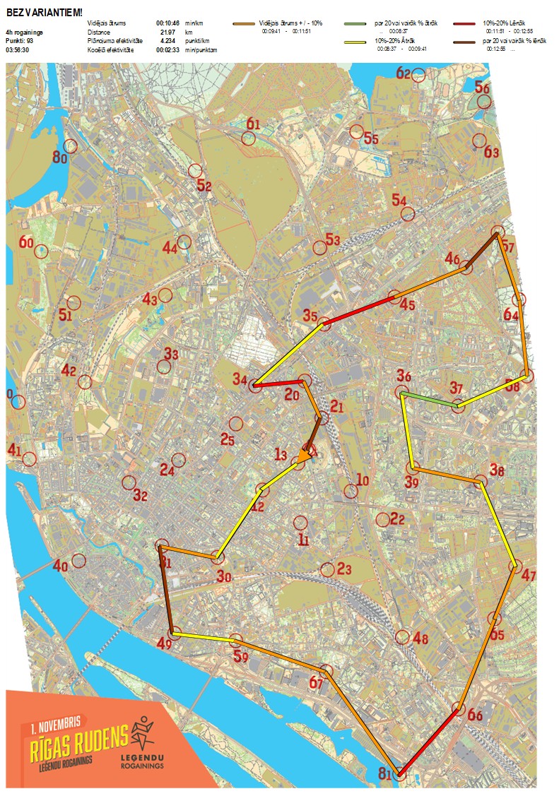 | Secības nr | KP nr | Laiks | Punkti | Kopējie punkti | Posma laiks | Kopējais laiks | Posma distance | Kopējā distance | min/km | min/pts | Vieta etapā |