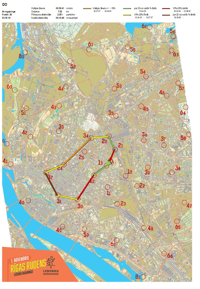 | Secības nr | KP nr | Laiks | Punkti | Kopējie punkti | Posma laiks | Kopējais laiks | Posma distance | Kopējā distance | min/km | min/pts | Vieta etapā |