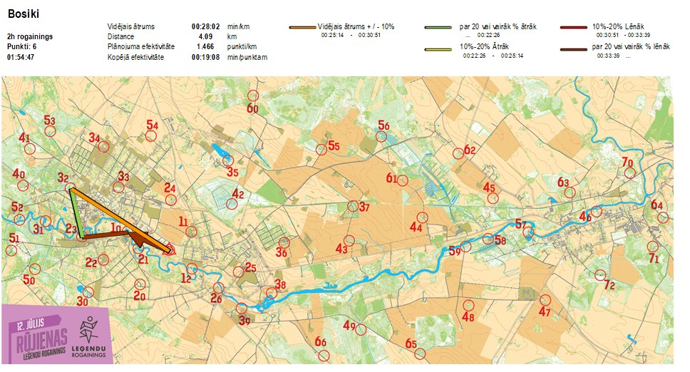 | Secības nr | KP nr | Laiks | Punkti | Kopējie punkti | Posma laiks | Kopējais laiks | Posma distance | Kopējā distance | min/km | min/pts | Vieta etapā |