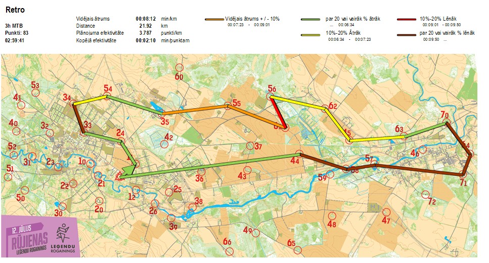 | Secības nr | KP nr | Laiks | Punkti | Kopējie punkti | Posma laiks | Kopējais laiks | Posma distance | Kopējā distance | min/km | min/pts | Vieta etapā |