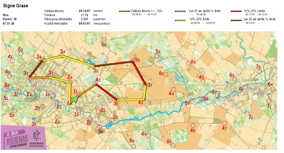 | Secības nr | KP nr | Laiks | Punkti | Kopējie punkti | Posma laiks | Kopējais laiks | Posma distance | Kopējā distance | min/km | min/pts | Vieta etapā |