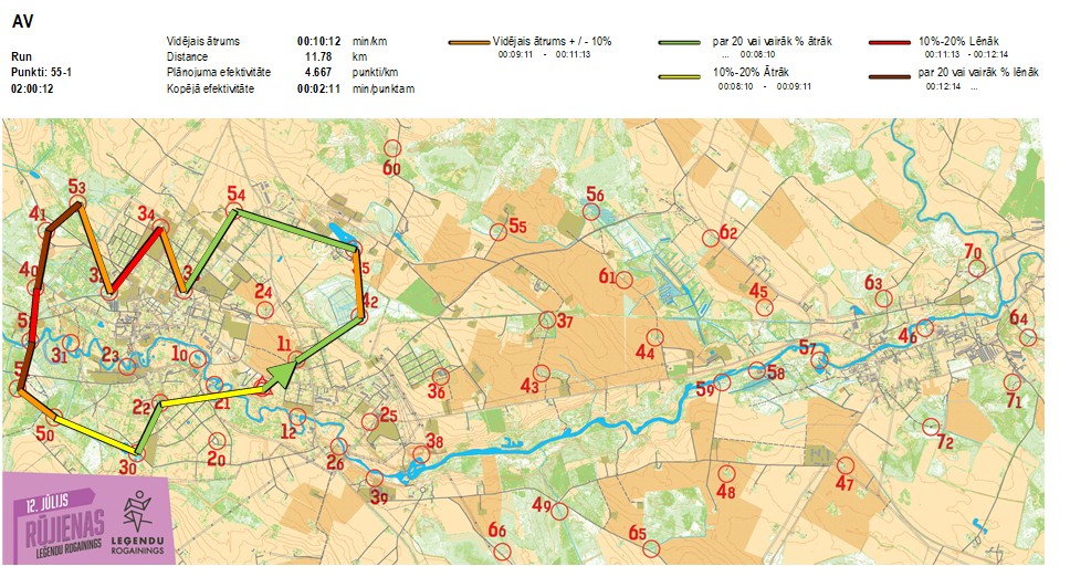 | Secības nr | KP nr | Laiks | Punkti | Kopējie punkti | Posma laiks | Kopējais laiks | Posma distance | Kopējā distance | min/km | min/pts | Vieta etapā |