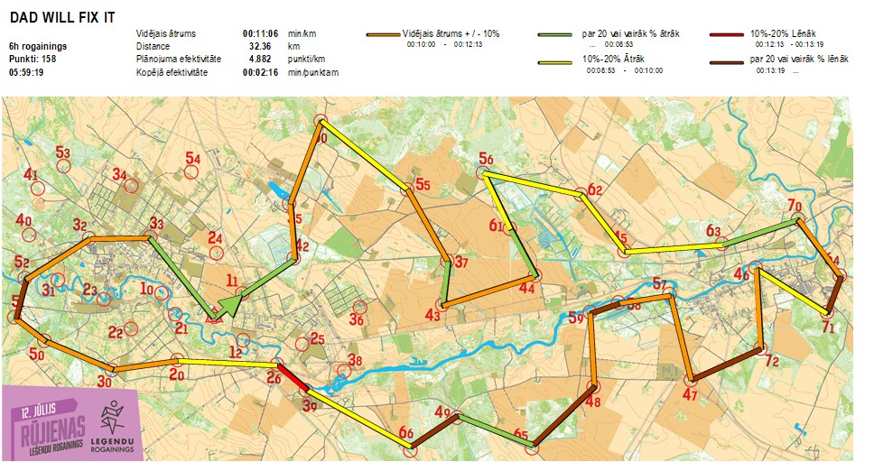 | Secības nr | KP nr | Laiks | Punkti | Kopējie punkti | Posma laiks | Kopējais laiks | Posma distance | Kopējā distance | min/km | min/pts | Vieta etapā |