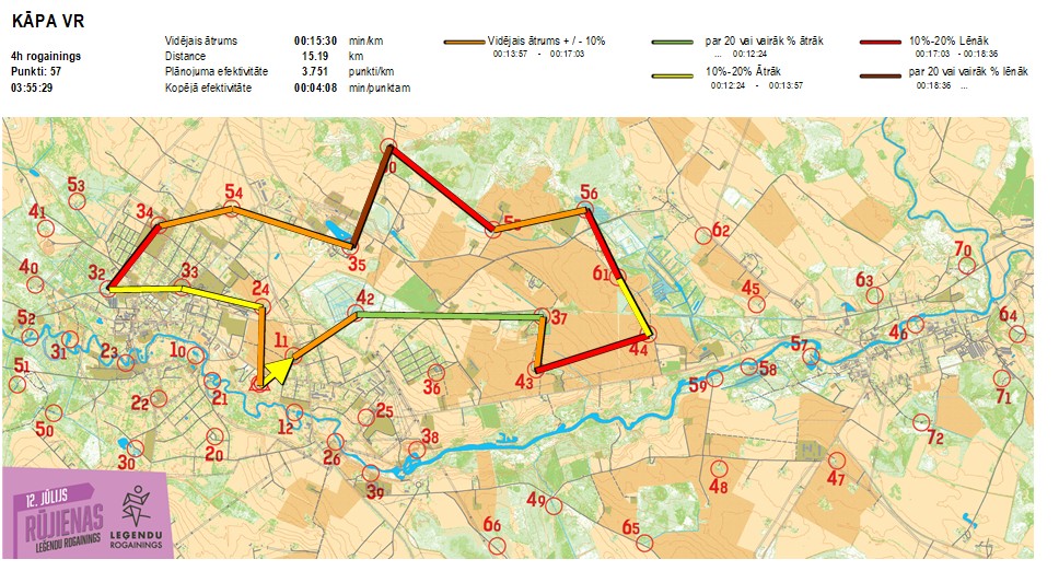 | Secības nr | KP nr | Laiks | Punkti | Kopējie punkti | Posma laiks | Kopējais laiks | Posma distance | Kopējā distance | min/km | min/pts | Vieta etapā |