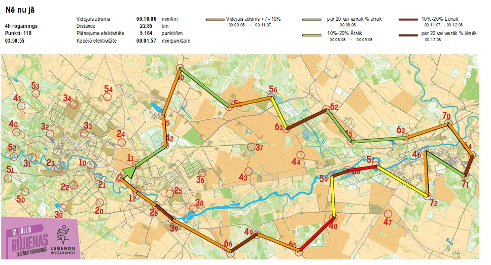 | Secības nr | KP nr | Laiks | Punkti | Kopējie punkti | Posma laiks | Kopējais laiks | Posma distance | Kopējā distance | min/km | min/pts | Vieta etapā |