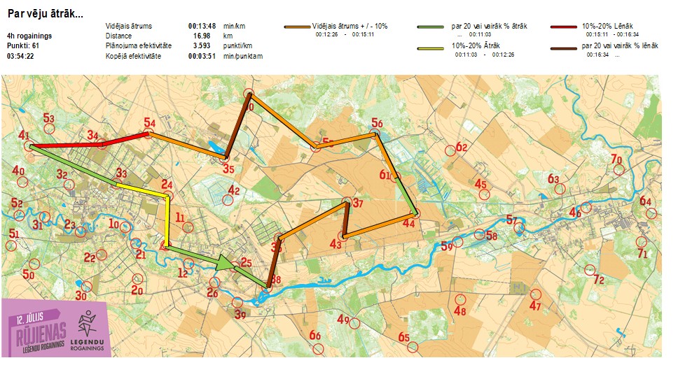 | Secības nr | KP nr | Laiks | Punkti | Kopējie punkti | Posma laiks | Kopējais laiks | Posma distance | Kopējā distance | min/km | min/pts | Vieta etapā |