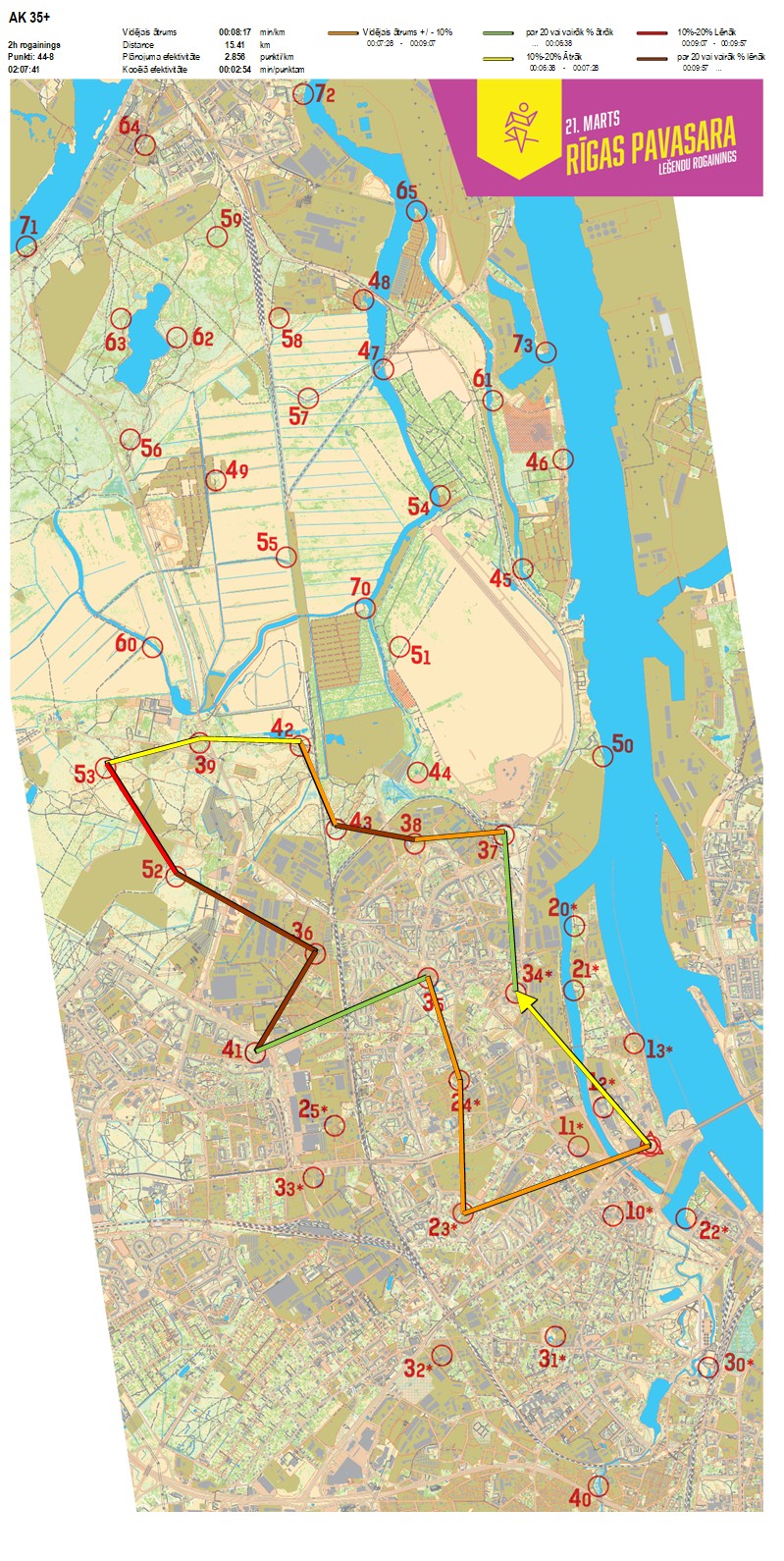 | Secības nr | KP nr | Laiks | Punkti | Kopējie punkti | Posma laiks | Kopējais laiks | Posma distance | Kopējā distance | min/km | min/pts | Vieta etapā |